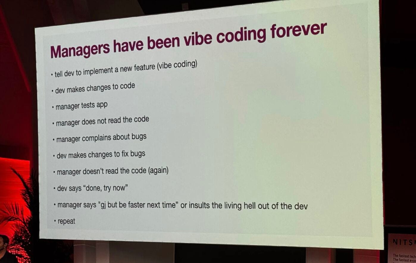 This is vibe coding via humans — also known as management. In the picture it’s not great management maybe, but management nonetheless.