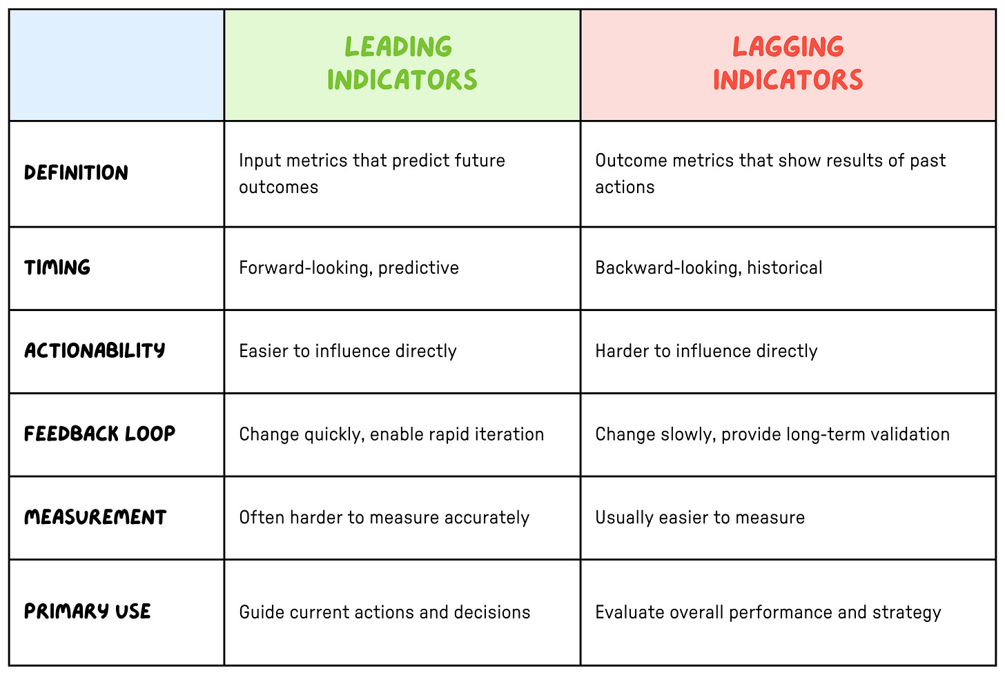 Lagging indicators change slowly, are easy to measure, but hard to influence directly. They validate long-term success, but you can’t use them to change direction.