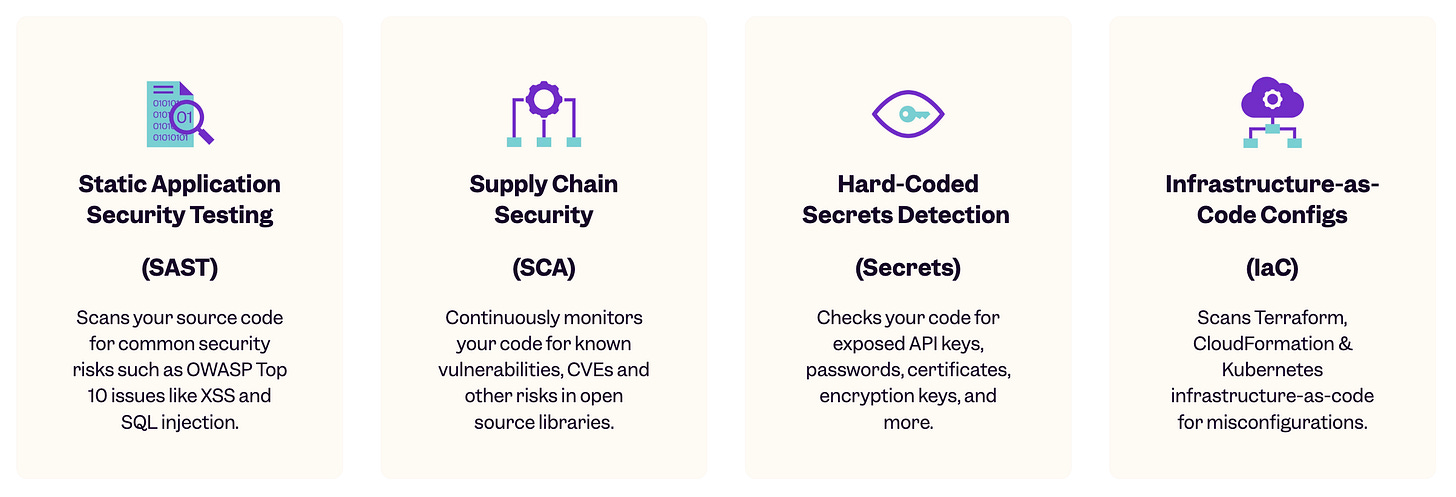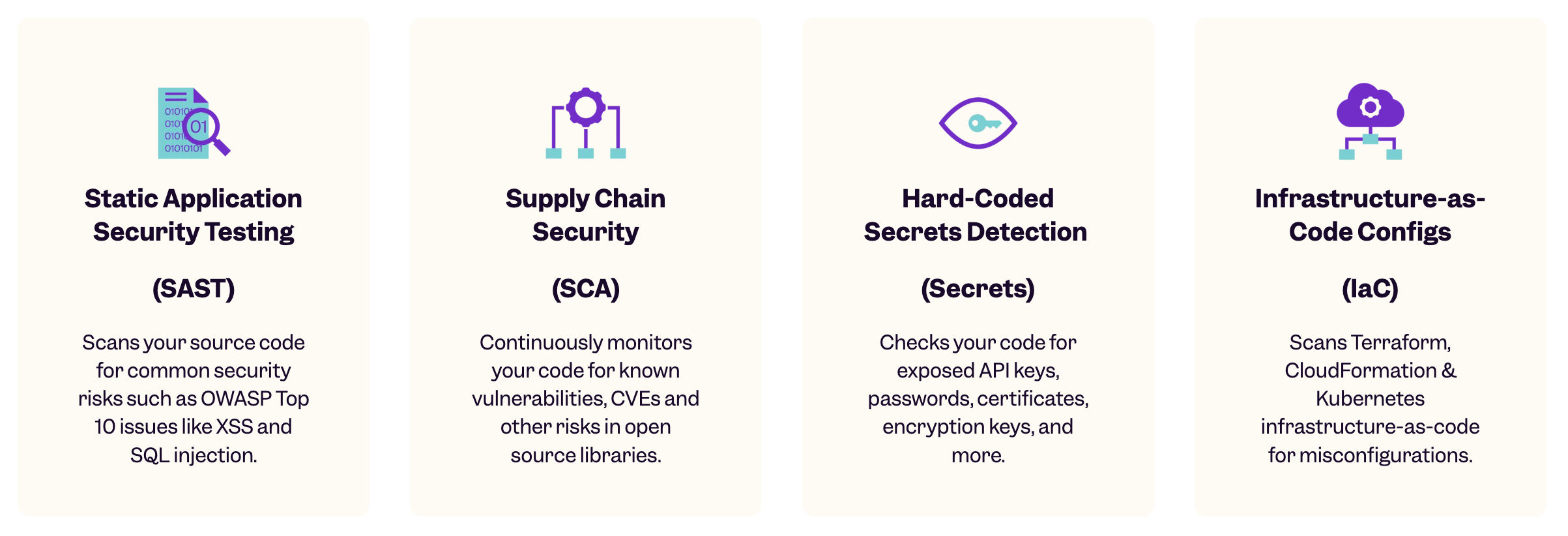 Secrets β finds hard-coded secrets in your code, like API keys or certificates.