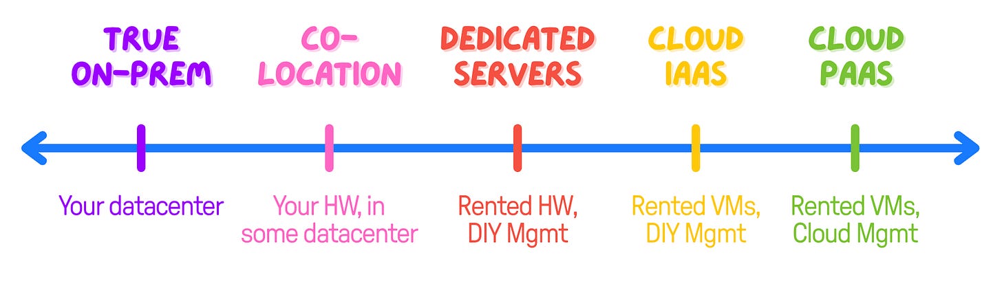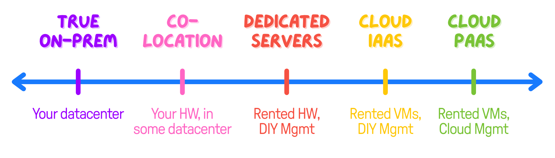 So, the choice isn't just cloud vs on-prem. It's first of all whether you want your hardware in your building, your hardware in someone else's building, rented hardware, or rented virtual resources.