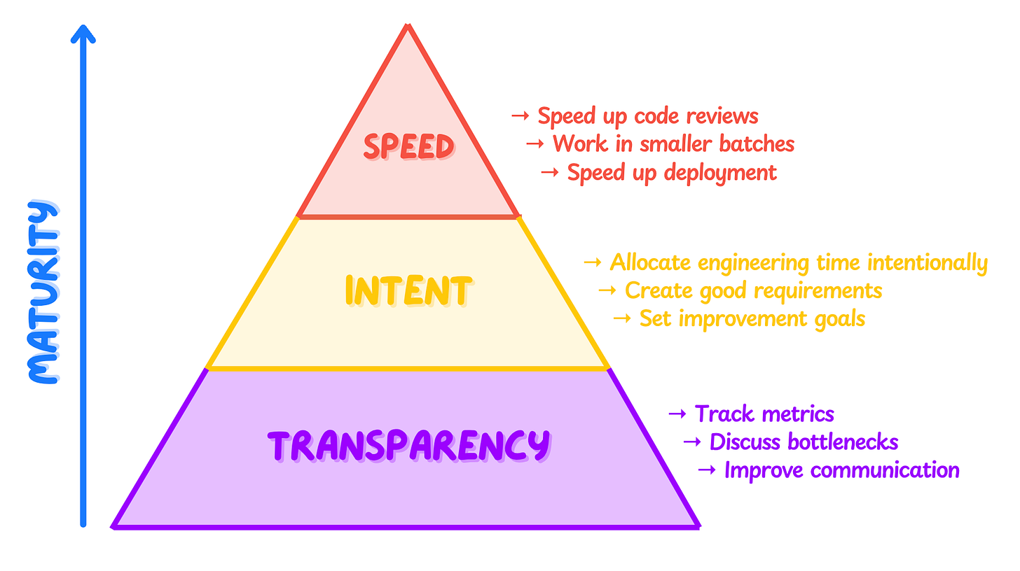 🔥 Speed — is the tip of the pyramid. Going fast is only helpful and sustainable when you are going in the right direction (intent) and you have a good feedback loop to steer your practices if needed (transparency). So, good teams are fast, but fast teams are not necessarily good. Shipping every day doesn’t magically turn you into an elite engineering team — but if you are an elite engineering team chances are you are shipping every day.