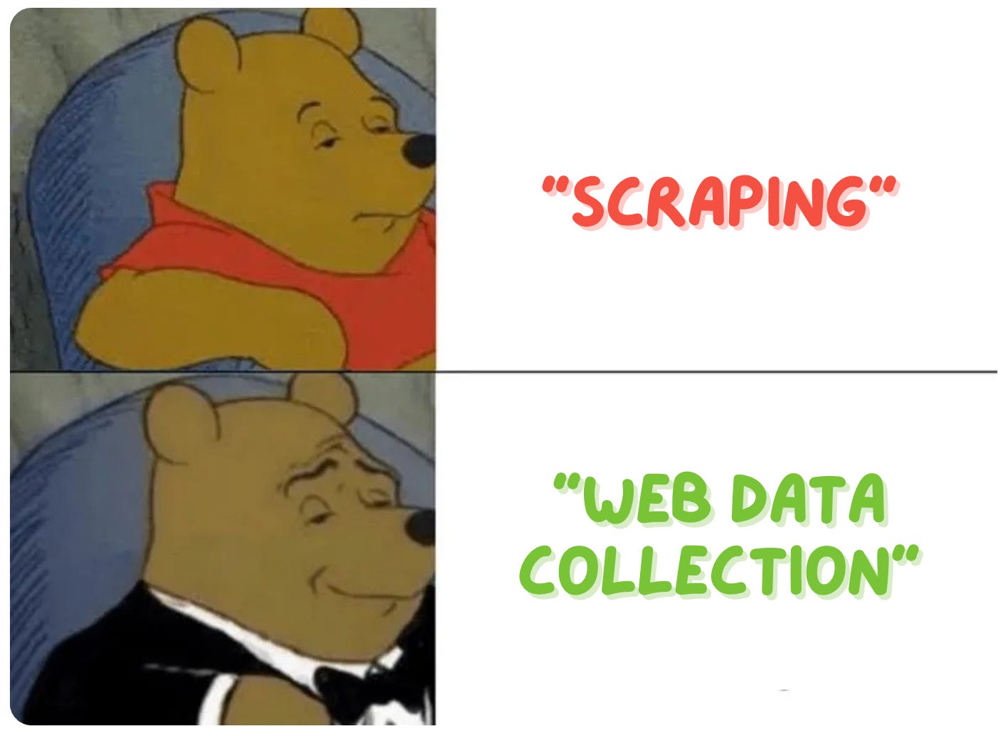 The problem with scraping (or web data collection 🧐🎩) is that there are just so many ways of doing that, leading to some of the biggest it depends in engineering.