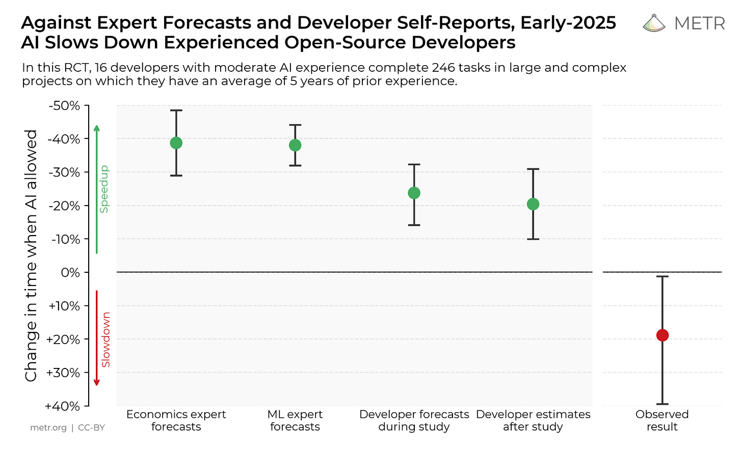 Just a couple of weeks ago, new research from METR dropped and challenged the very assumption that developers were getting any help from AI. Pretty much the opposite: they concluded that models slow down humans on realistic coding tasks.