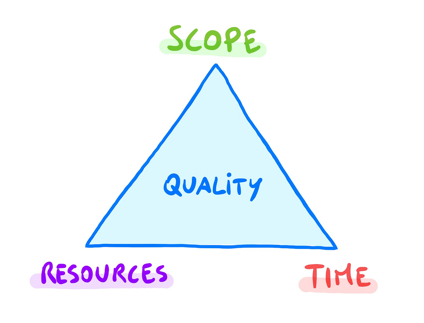 In particular, resources (or budget) often don’t have an immediate impact on the other two. You can't usually say "I want to pay twice as much so you can deliver the app in half of the time", because: