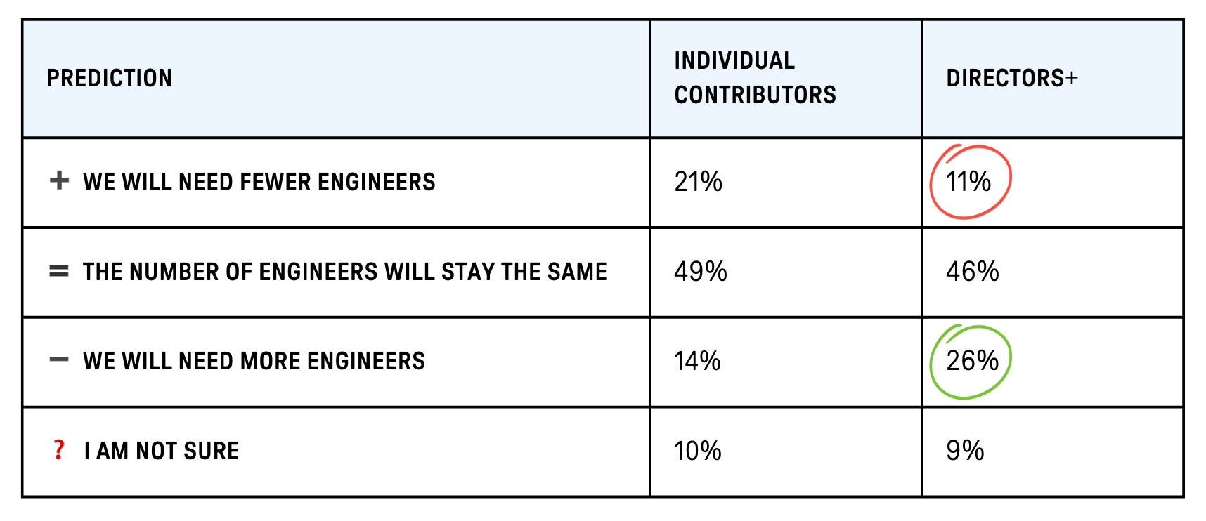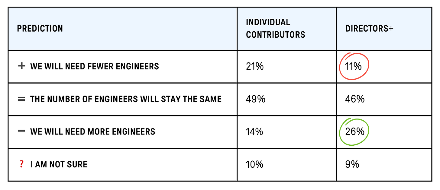 And in our industry report from Q4 last year, we reported how Directors, VPs, and CTOs are skeptical about AI reducing our need for engineers. They actually think weβll need more π