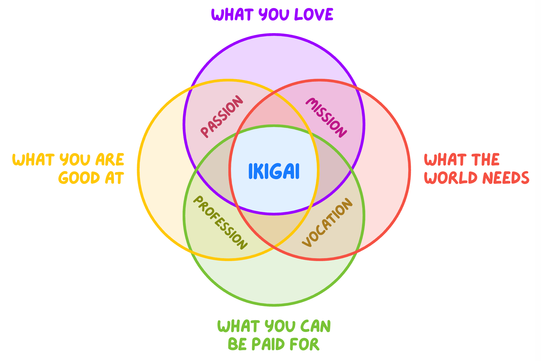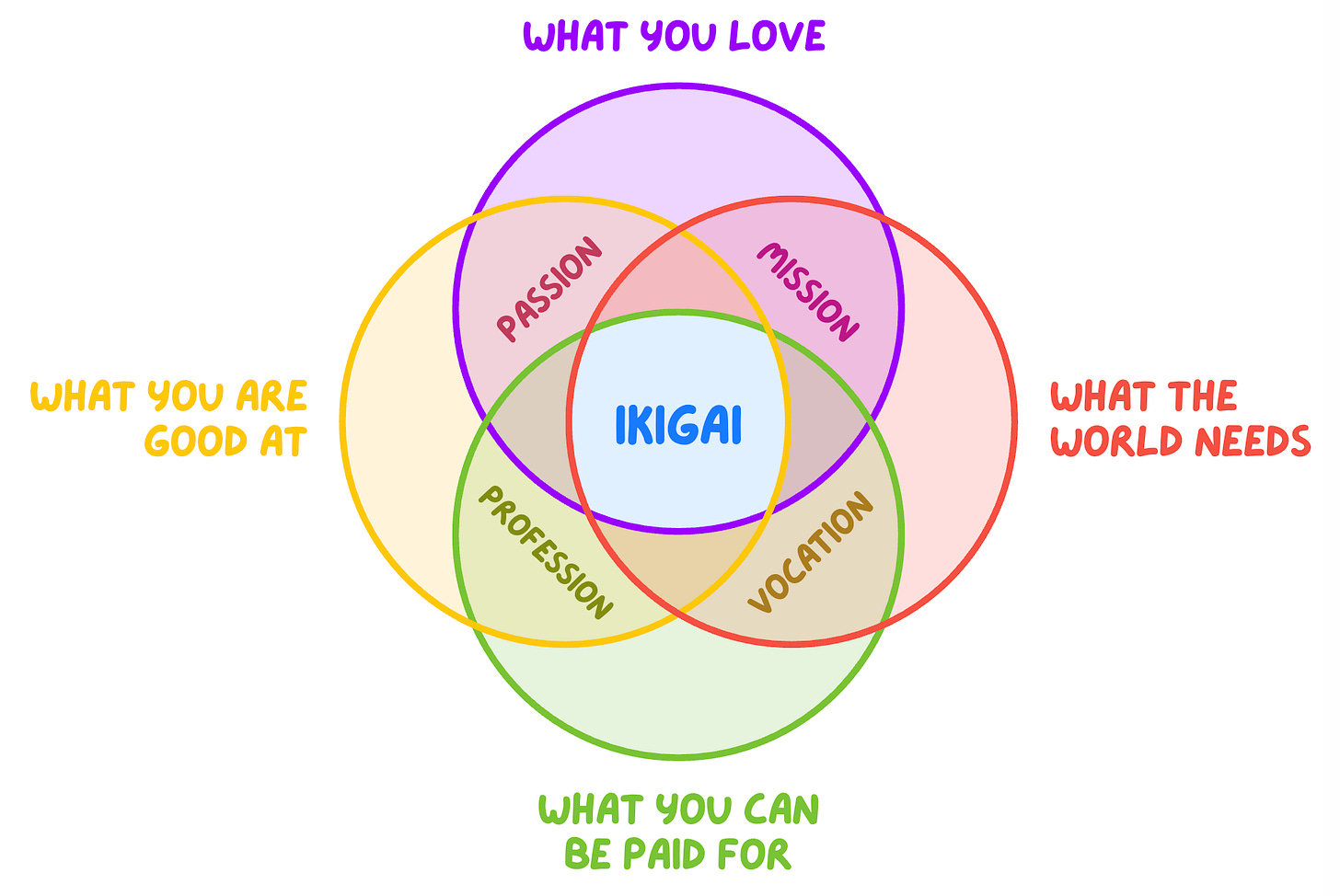 Ikigai1 is used to refer to a passion that gives value and joy to life, by sitting at the intersection of four pillars: