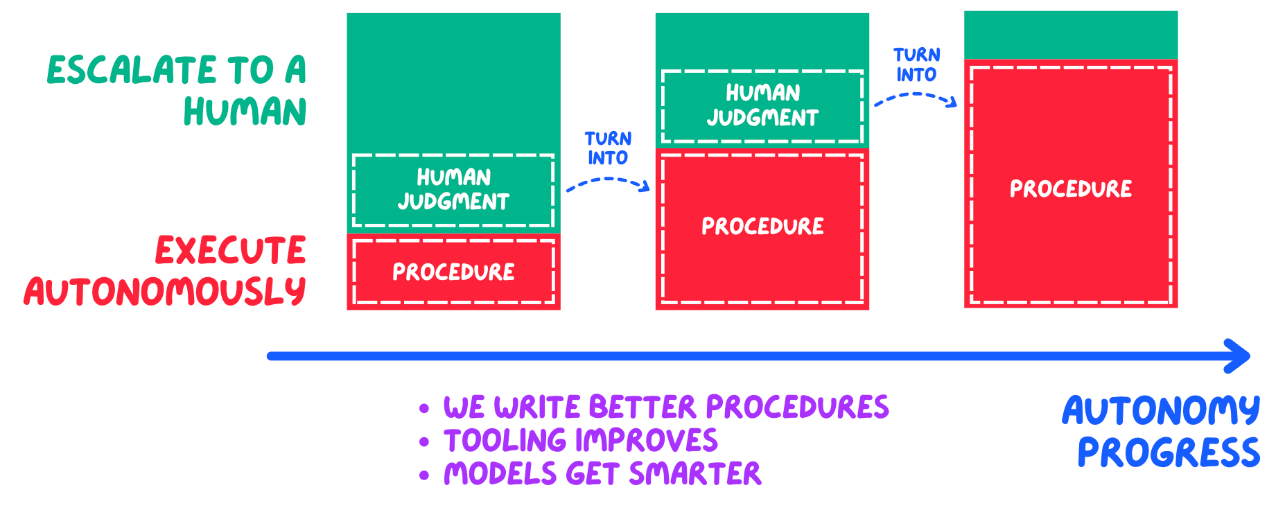 Designing for this is hard, which is the reason why successful deployments usually don’t go full autonomy from day one (or ever). They escalate to humans for high-stakes decisions, and gradually expand the agent’s authority as trust is established.