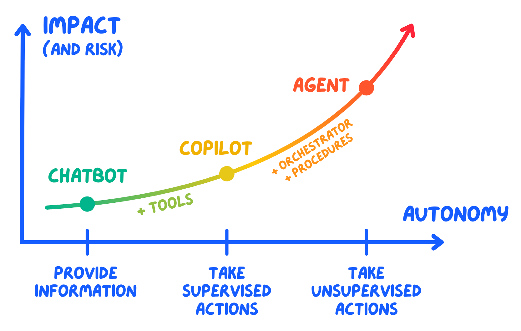 🤖 Agents act, they don’t just respond — The key distinction from chatbots and copilots is that agents take actions with real consequences. This makes them powerful but also risky.