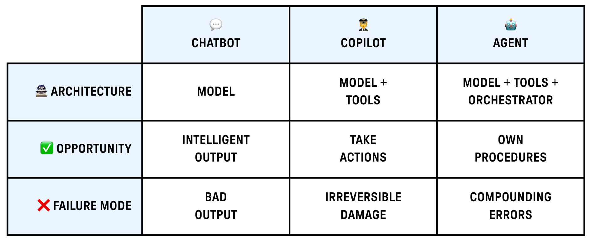 🧑✈️ Copilots — assist humans in doing work. They can access context (your codebase, your documents), draft outputs, and take some actions. But a human remains in the loop, reviewing and approving. Think ChatGPT with tools.