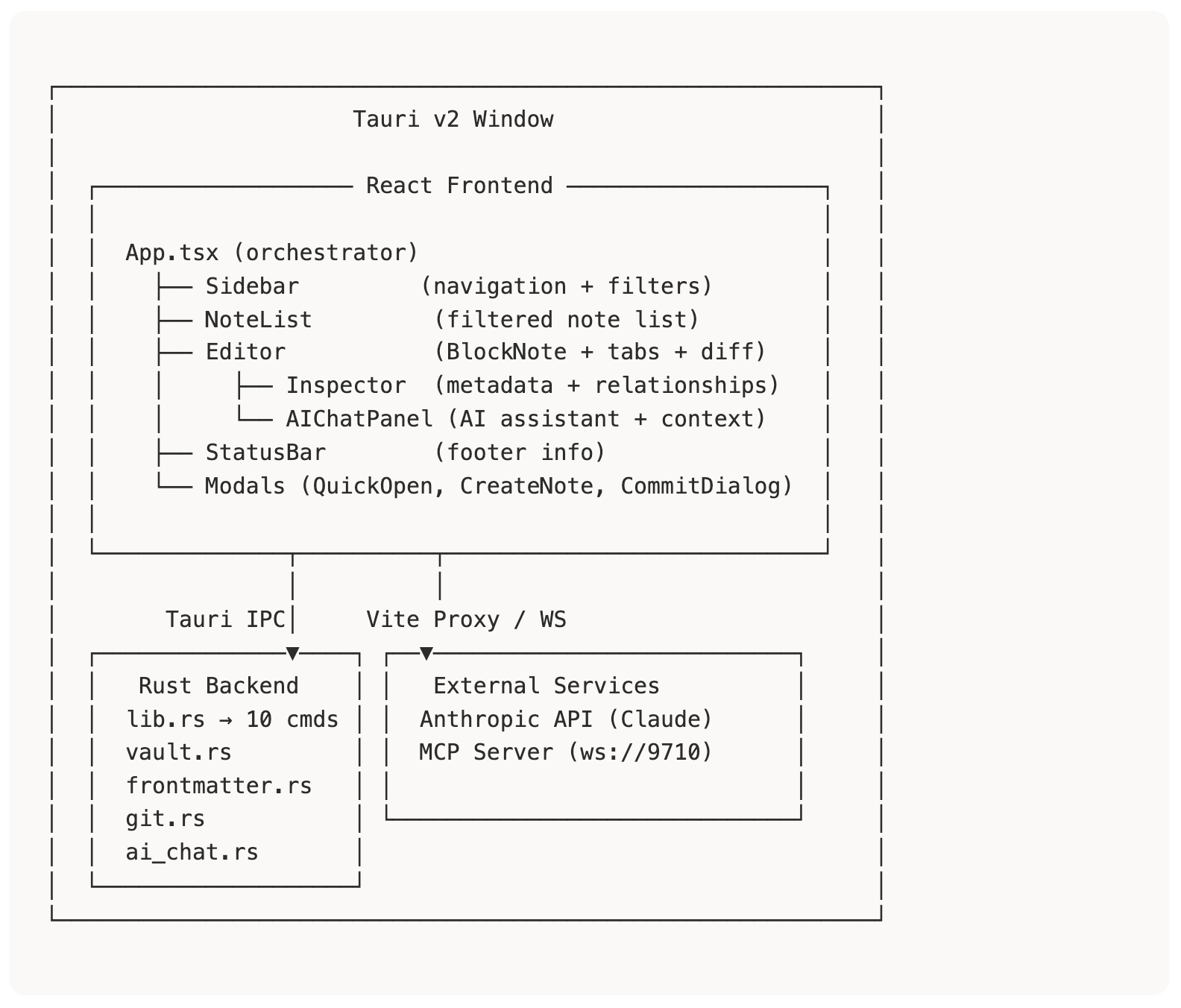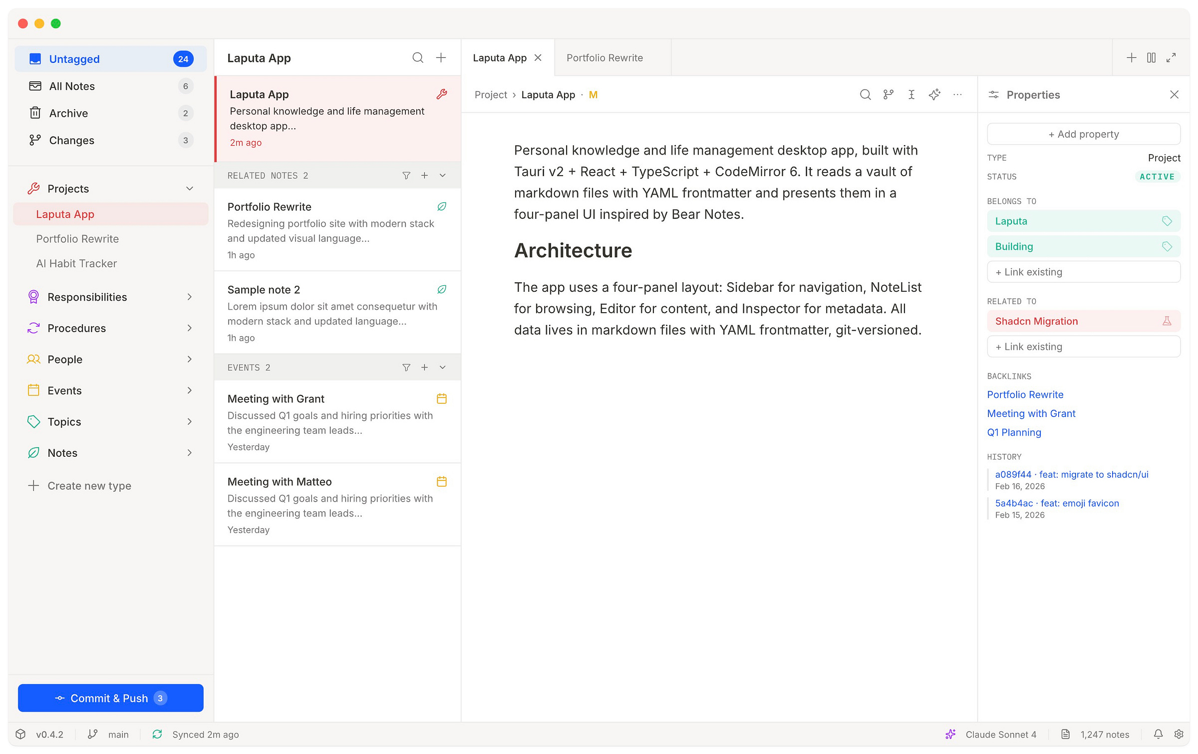 🧩 Abstractions — the key concepts we are invested in. Things like the document model, relationships-as-wikilinks, or the frontmatter format for properties. These are more likely to change than architecture, but are still foundational to how the tech works.