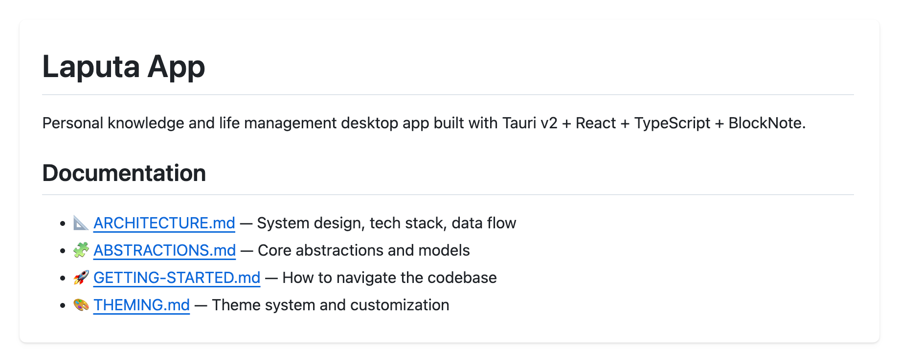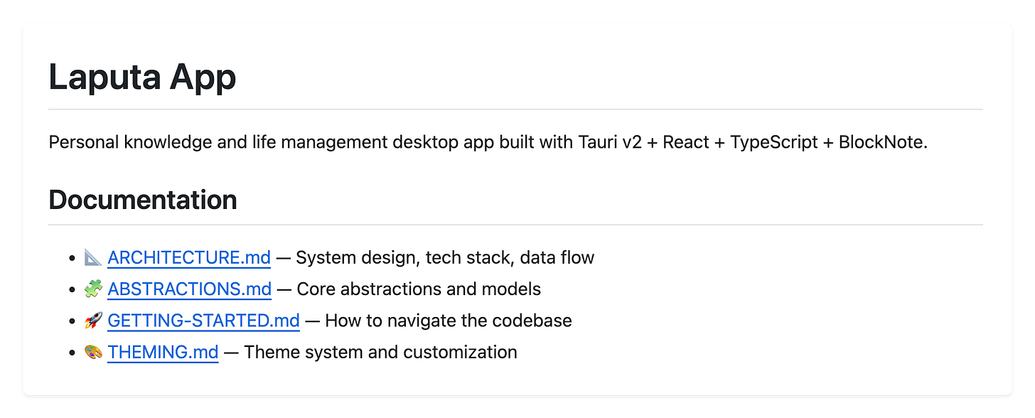 📐 Architecture — contains the big pillars. The tech stack, main components, state management, and so on. It’s also the things that change the least often.