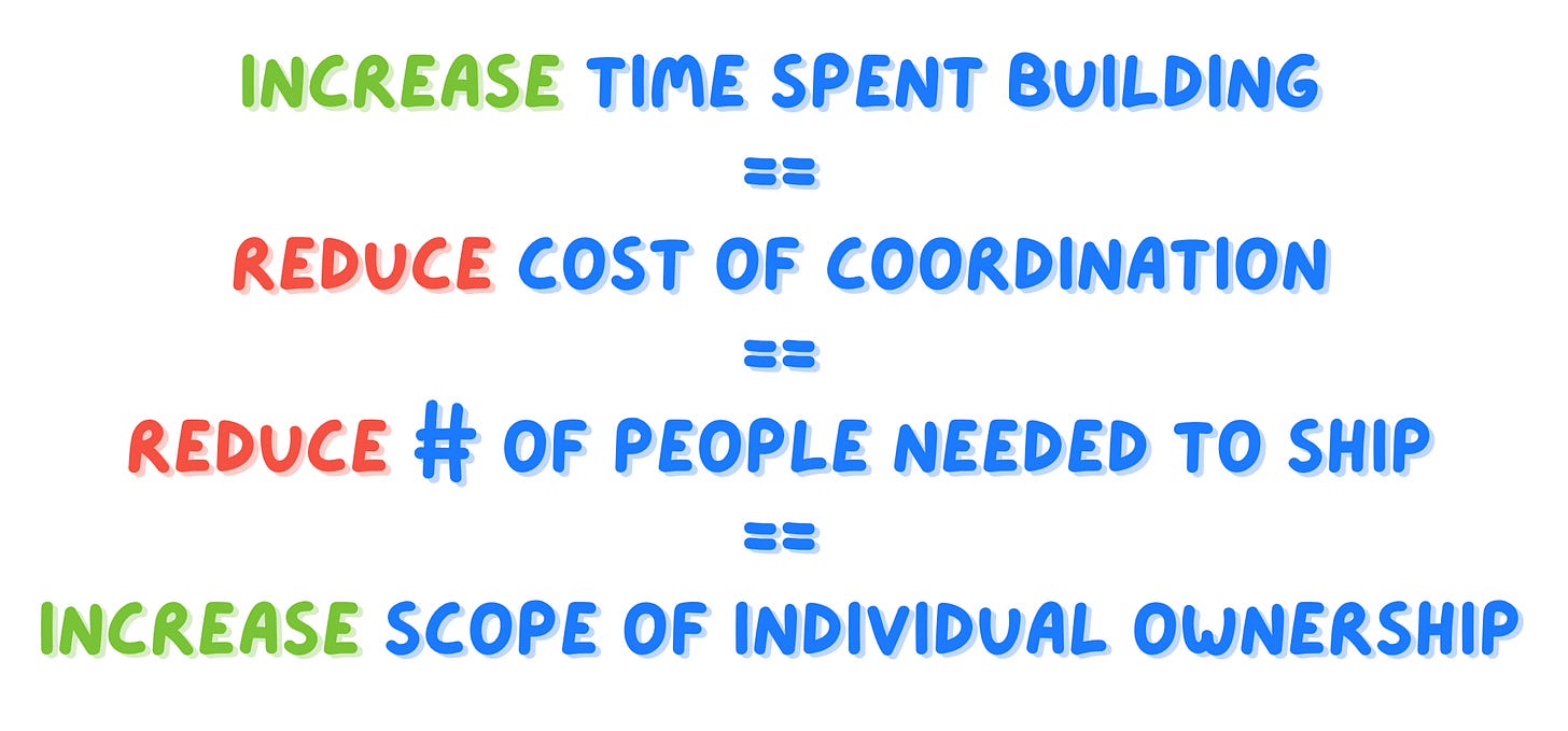 The only way an engineer can ship 5 different things in a day is that they don’t need to spend a lot of time coordinating with others — which is evident from Gergely’s write-up.
