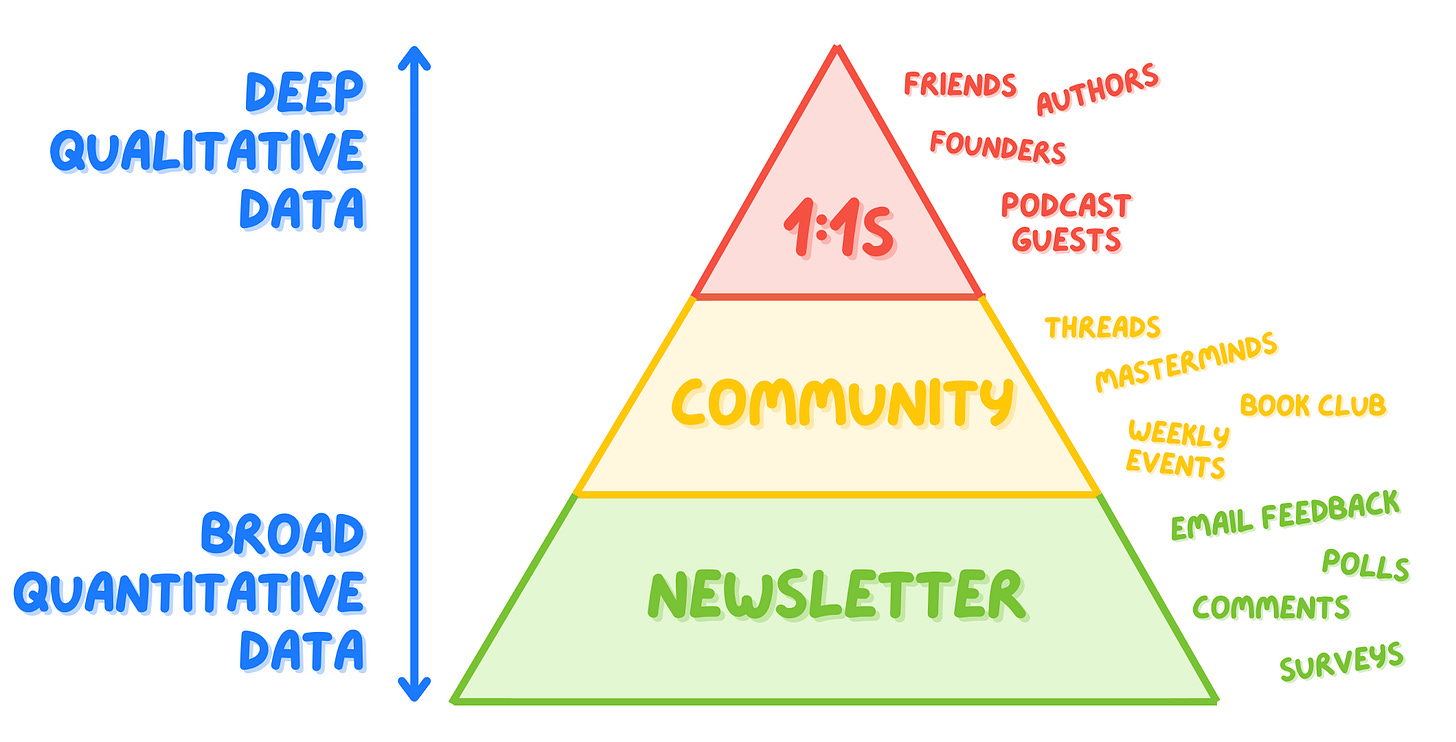 All in all it’s like a big pyramid of information that goes from broad, quantitative data points, to deep, qualitative (but also more anecdotal) ones 👇