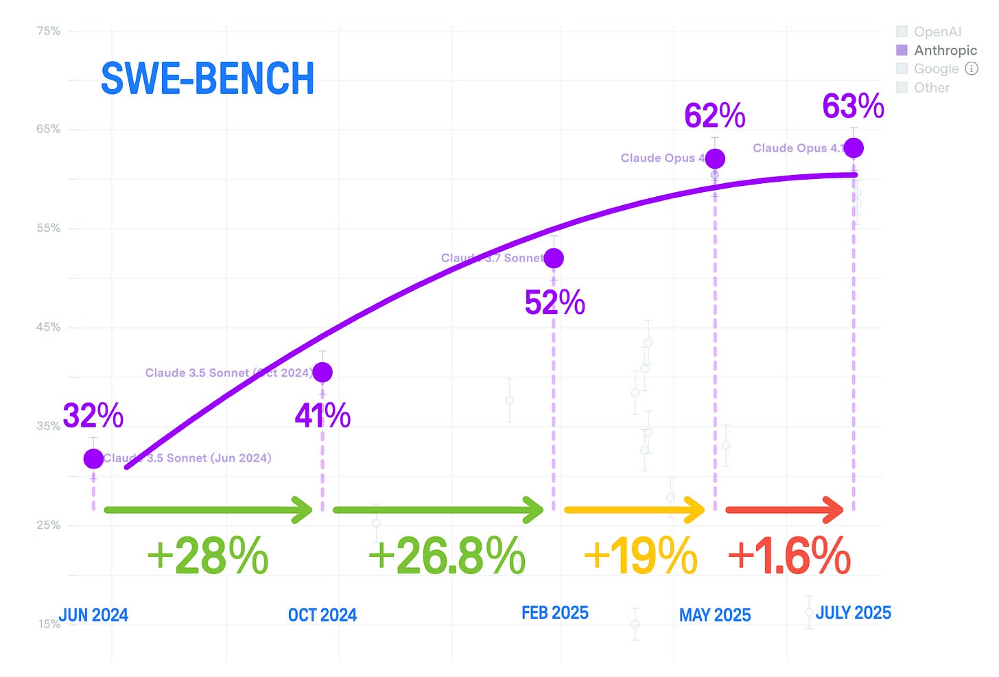 In the meantime, AI models seem to be plateauing, or at least getting into the land of diminishing returns. Anthropic models, which have always consistently topped the SWE-Bench (the most reputable coding benchmark), have been following a trend of increasingly smaller, shorter, and more incremental iterations. OpenAI’s latest GPT5 follows the same trend.